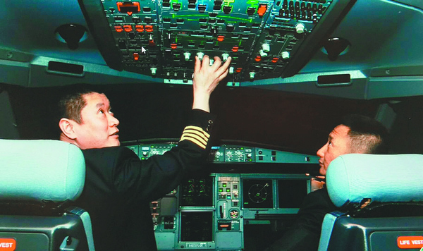 两位机长在“奥运圣火号”驾驶舱里合影。