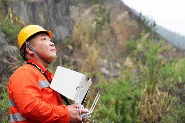 鼓山燕前隧道出口被陡峭的山壁包围着,几乎是半爬着到达作业点的,许多裸露的石坡都覆盖着防护网。关荣军熟练地操纵着航拍机时而由高往低、 时而由左往右、时而360度盘旋地检查着每寸陡坡。
