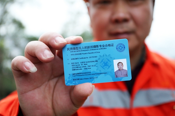 今年50岁的关荣军曾患喉癌,说话声音嘶哑,发声时略显吃力,但这并不影响他的工作热情,凭借30年的路桥工作经验,关荣军熟知段管内线路周边的地质情况、人工检查存在盲点区域的隐患,为此他想到了现在被广泛运用的无人机“VR”技术,经向领导申请参加了无人机驾驶航拍机培训并取得了合格证书,段专门为他配备了航拍机。