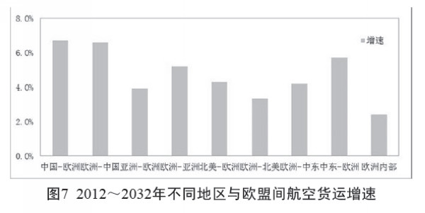 近年受到国际经济萎缩和欧洲债务危机影响,全球航空货运暂时出现负增长,但预测随着未来经济形势的好转,航空货运业将保持增长态势,本文选取了不同地区与欧盟间航空货运增速的相关预测,如图7 所示,不同地区间发展速度差异相当显著。