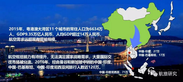 实际上,粤港澳大湾区多机场系统的运输规模已跻身世界大都会区或湾区的前列,但并未能有效满足国家战略、区域经济与社会发展的要求。根据2015年的统计数据,粤港澳大湾区11个城市的常住人口已达到了6634万人,GDP达到了9.35万亿人民币,人均GDP超过14万人民币,按照市场基础测算其航空需求,潜在规模远远超过现有的运输规模。这就意味着,仍然有大量的需求被周边国家或地区机场所分流。根据一份来自OAG的数据统计,2016年,经由曼谷和新加坡中转的中国-印度、中国-巴基斯坦、中国-印度尼西亚间旅行人数近120万。由此可见,大湾区的航空枢纽能力仍然有待提升,仍然无法满足国家战略需求,更无法有效支持民航局提出的“建好三个网络”的战略要求,需要湾区机场协同发展,努力提升其国际竞争力。